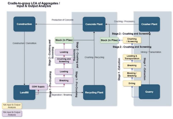 The primary goal of this research is to compare the properties of RAs with NA and also conduct a Life Cycle Assessment (LCA) to evaluate the environmental impact of their production. In the quality approach, the properties of RAs and RAC are being discussed and compared based on the literature. In the environmental approach, for the calculation of the CF, the LCA method is used. In order for RAC to achieve the same levels of compressive strength as NAC, more cement needs to be added. Cement accounts for 80% of the production of concrete emissions [17]. So, to illustrate the benefits of RAs, the system studied only focuses on the aggregate footprint.