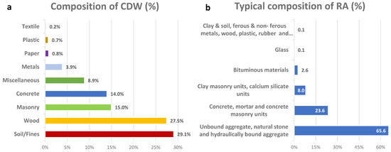 (a) Composition of CDW (processed data from [22]). (b) Typical composition of 8–16 mm RA from a recycling plant (processed data from [24]).