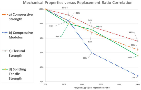Compressive strength: Compressive strength of concrete decreases, as the RR of NA increases [4,23,26,27,29,31,32,46,47,48,49,50,51,52,53,54,55,56,57]. Figure 4. represents the findings of Wang et al. [4] in which the correlation between the mechanical properties and the RR of RAs is depicted. Up to a degree of 50% RR, RAs have no significant impact on the compressive strength of concrete [4,26,27,29,46,47,48,49,50,51,52,54,56].