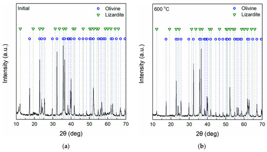 As mentioned before, the initial sample consisted of olivine and serpentine, with the lizardite being the main structure (Figure 1a). According to the XRD diagrams, the sample’s thermal treatment at 600 °C limited the lizardite content as its corresponding peaks presented lower intensity (Figure 1b). At 700 °C (Figure 1c), peaks that were attributed to lizardite were eliminated and those that overlapped were excluded, while an even higher temperature of 800 °C (Figure 1d) presented no effect on the olivine structure.