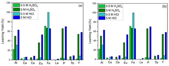 In order to maximize the leaching process efficiency, the effect of acid molarity for various acid types was investigated. For the hydrometallurgical process, hydrochloric (HCl) and sulfuric (H2SO4) acids were used preferably, and the leaching efficiency at different molarities of the acids was studied. The efficiency of REE leaching was found to be directly proportional to the acid concentration for both types of acids and contaminants in the structure, such as Al, Fe, and P dissolving into the leaching solution rapidly (Figure 2).