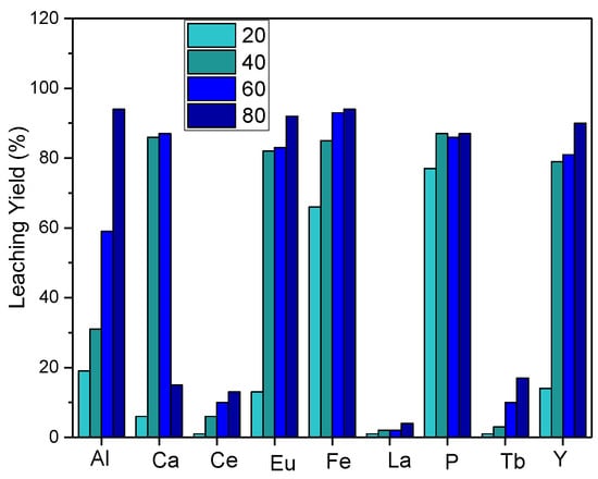 The leachability of various phosphor types obtained from end-of-life fluorescent lamp powder are different from one another, but red phosphors’ YOX structure has a higher dissolution efficiency. Phosphorus dissolves as a halo (Ca10(PO4)6FCl: Sb3+, Mn2+) > YOX (Y2O3:Eu3+) > LAP (LaPO4:Tb3+, Ce3+) according to the literature []. The difference in the dissolving rate was attributed to YOX crystal lattice’s lower level of complexity as compared to the LAP and CAT structures.