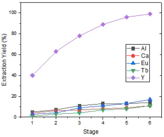 Y was dissolved in the first-stage leach solution at a high concentration, and pregnant leaching solutions also contain valuable elements such as Eu, but also Ca, Al, Si, P, and Mn impurities in small amounts. DEHPA has been demonstrated to be the most effective organic solvent for separating Y from Eu and impurities. Rare-earth metals in the feed solution were quantitatively transferred to the organic phase with 20% v/v D2EHPA in kerosene at pH 0.5. In these conditions, the separation took six stages of load and stripping. The six-stage Y loading efficiency was calculated as approximately 98% and the stripping efficiency as 97%. The purity of Y2O3 in the precipitation after the stripping process was analyzed as 76.94%. In addition to element Y, there were also elements Eu, Ca, Al, and Tb as impurities. Figure 6 shows that Y was loaded at 99% when the six-stage loading process was applied.