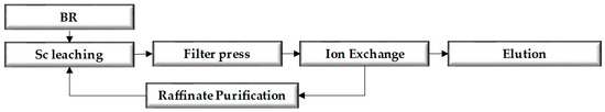 One method proposed for recovering scandium (Sc) from BR is through its hydrometallurgical treatment with inorganic acids [7,8]. This technique has been recently developed on a pilot scale [9] and involves the dissolution of major and minor metals with sulfuric acid (H2SO4), generating a pregnant leaching solution (PLS). The dissolved Sc in the PLS was 12.5 ± 0.6 mg/L while Fe and Ti impurities were 219 ± 34.0 and 33.6 ± 3.3 mg/L, respectively. The SO42− content of the PLS was 78 ± 0.8 g/L. After the leaching process, the PLS undergoes an ion exchange process to recover scandium [10]. This process involves passing PLS through an ion exchange column that contains a selective resin. The resin exchanges the scandium cations selectively. The Sc recovery was 83% following the same leaching trend with Fe, while the Si recovery was extremely low. Titanium decreases from 23 to about 0.5 g/L over 4 days of retention time, and iron and aluminum remain in the solution at high concentrations (49.7 and 9.7 g/L, respectively) [11]. Subsequently, the resin is treated with an alkaline solution to elute scandium and other elements. The eluted solution is then subjected to further purification steps, including precipitation, filtration, and other separation techniques, as shown in Figure 1 [11]. As a result of this process, a raffinate solution is generated, which primarily contains H2SO4 and various dissolved impurities, such as aluminum, sodium, calcium, iron, and sulfate ions.