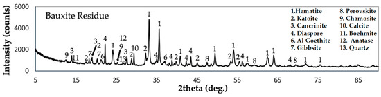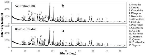 For the neutralization process, the BR pulp was added to a beaker through constant magnetic stirring. The raffinate solution was then added gradually until the pH of the solution was close to 6. The pH of the BR pulp was equal to 10.8 ± 0.16, while the pH of the neutralized BR pulp was equal to 7.03 ± 0.15. The chemical analysis of the NBR sample is reported in Table 3 and the chemical analysis of the resulting spent solution can be seen in Table 4. The XRD graph of the BR and the NBR is shown in Figure 4a,b, respectively.