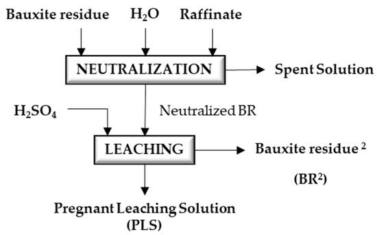 Given the alkaline nature of BR, the consumption of H2SO4 in the BR leaching step comes with a high consumption rate and is the most important cost item of the process. In the case of the Greek BR leaching demonstrated at Mytilineos, the demand for sulfuric acid reached 0.27–0.29 t per t of treated BR, in order to achieve a selective Sc leaching process [9]. To reduce the process’s overall cost, the raffinate solution needs to be reutilized. The technology considered in this study involves neutralizing the BR before leaching with the raffinate solution produced from the ion exchange to reduce acid consumption in the new leaching. This study compares leaching experiments conducted with the conventional procedure (direct BR leaching) with experiments conducted using the neutralized bauxite residue (NBR) in order to analyze the final bauxite residues (BR2) and resulting PLS. The findings of this study will provide valuable insights into potential ways to reduce the cost of the BR leaching process.