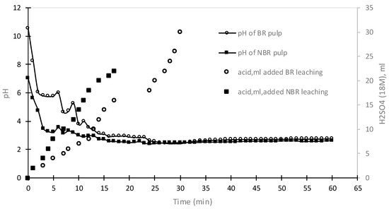 In the leaching process involving the non-neutralized BR, the BR pulp was formed in the reactor with a starting pH close to 11. To achieve the target pH value of 2.3, 30 mL of concentrated H2SO4 was required. The effect of acid addition on the pH of the solution for both BR and NBR is presented in Figure 5. The chemical analysis of the obtained PLS can be seen in Table 5. The XRD graphs of the residues after the non-neutralized BR leaching and the NBR leaching are presented in Figure 6a,b, respectively.