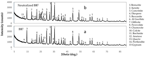 XRD patterns of the examined materials (a) BR, (b) neutralized BR.