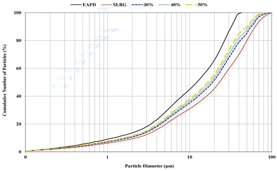 Table 1 presents the results of EAFD chemical analysis, which mainly depends on both the initial recycled iron scrap quality used and the final steel category being developed. Besides Fe and Zn, Ca was also present in a high amount mainly due to the lime added during the steelmaking process. EAFD and SLRG initial syntheses were co-grinded in a ball mill, and their corresponding particle size distributions are shown in Figure 1, together with that of the initial EAFD. It was found that in all cases, 50% of mixture particles were under 23 μm, while 90% of the particles were below 63 μm.