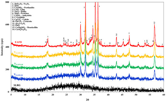 Mineralogical phases of the EAFD, SLRG and raw mixtures.