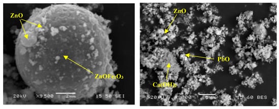 The mineralogical composition of both raw materials and raw mixtures is presented in Figure 2, whereas the corresponding SEM micrographs of the as-received EAFD are shown in Figure 3. Two major phases were identified: zincite and franklinite. Zinc in the as-received EAFD is in the forms of zincite (ZnO) and franklinite (ZnFe2O4), while Fe has been bound mainly in ZnFe2O4. Furthermore, other phases such as portlandite, lime, and calcite (Ca(OH)2, CaO, CaCO3), halite (NaCl), lead oxide and cerussite (PbO, PbCO3), CaMgSiO4 and CaAl4Fe8O19 are also present as minor constituents. The amorphous nature of SLRG was attested by the detection of a diffuse wide band coming from the glassy phase in the range of 15−40°, generated during rapid cooling. Regarding the EAFD morphological characteristics, both spherical fine-grained and elongated particles were detected (Figure 3). Agglomeration phenomena were predominant, as finer particles accumulate, developing aggregates or masking other larger particles. EDS analyses certified the existence of zinc and iron, while smaller amounts of calcium, lead, magnesium and chromium were also detected.