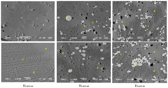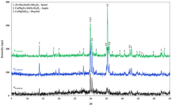 The vitrification process was carried out by replacing 30, 40 and 50 wt% of the EAFD with SLRG. The chemical analysis results of the vitreous outgrowths after sintering are given in Table 1. The mineralogical analysis results, obtained via X-ray diffraction, are presented in the corresponding patterns in Figure 4. In the case of 70 wt% EAFD substitution, the glassy matrix is predominant, whereas as the EAFD content is increased, three major crystalline phases were detected: spinel (Fe,Mn,Zn)(Fe,Mn)2O4, augite (Ca(Mg,Fe,Al)(Si,Al)2O6) and diopside (CaMg(SiO3)2). Spinel was absent in the case of VEAFD30, whereas it was one of the dominant crystalline phases in case of lower SLRG content (Fe and Zn content increment). Augite is a pyroxene mineral incorporating a wide range of cations. In the case of the CaO-MgO-Al2O3-SiO2 glass system, augite and diopside (both clinopyroxenes) are normally the main crystal phases. Diopside is the end-member clinopyroxene, while augite is the main phase.