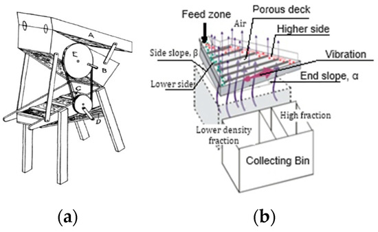 (a) A typical dry washer and (b) the air table’s operating principle. ↑ with small purple arrows in (b) displaying the air flow direction and with thick arrow the longitudinal direction of vibration.