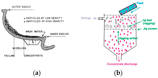 Jigs are open and water-filled tanks [16] (Figure 3b), with a horizontal screen in their upper part and a concentrate collection nozzle at the bottom. The mechanical pistons cause the water’s pulsating movement, thus separating particles with different specific gravities. In order to separate particles of different specific gravity there must be a difference in the settling rates of the solid particles being processed. More specifically, the heavier particles have a higher settling velocity than the lighters, so they remain in the lower part of the bed during the stratification. As a result, a portion of the heavy particles that pass through the screen holes is collected and placed back on its surface (ragging bed), allowing only the very high specific gravity particles to reach it and be further separated in the next feed.