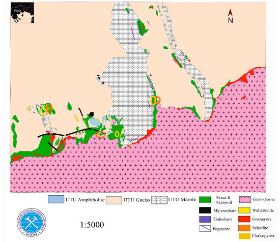 Geological map indicating the main skarn zones and related Fe skarn mineralization (modified after [6]).