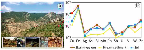 (a) Panoramic view of the Fe-Cu skarn deposit at Kimmeria, Xanthi. Inset photos depict various stages of the fieldwork. (b) Geochemical distribution patterns comparing the average abundances of certain elements in skarn-type mineralization, soils, and stream sediments (Fe = Fe2O3; values in ppm).