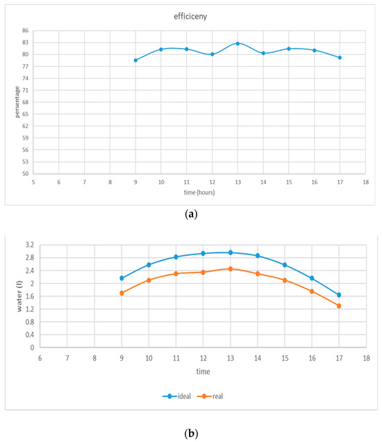 (a) Relationship between efficiency in percentage and time; (b) relationship between ideal and real water values with respect to time.