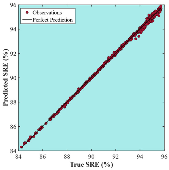 The R2 graph serves as a crucial visualization tool, showcasing the GPR model’s proficiency in capturing underlying patterns and variations in the dataset. The near 1 R-squared value indicates the model’s capability to explain a substantial proportion of variability in the observed data. This capability is particularly essential in an industrial setting, where correct predictions of SRE values are paramount for assessing and optimizing sulfur recovery units. Furthermore, the accurate prediction of SRE values positions the GPR model as a trustworthy surrogate model in optimization networks.