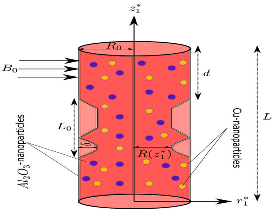 Bi-directional and unsteady blood flow through a cylindrical stenotic artery is investigated in this suggested model. The cylindrical coordinate system is utilized. The flow is assumed to be axisymmetric; therefore, all the variables are independent of . The magnetic field is applied normally to the blood flow. The temperature field and velocity field of the nanoparticles are provided by: