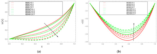Table 1 presents the thermophysical characteristics of copper (Cu), aluminium oxide () and the base fluid blood. The comparison between our suggested model and Ijaz and Nadeem [11] is shown in Table 2. The results show that there is a very excellent and satisfying agreement. Figure 1 explains the influence of the magnetic parameter M on the velocity profile w(x). Applications of magnetic fields that regulate blood flow for medical purposes heavily depend on the magnetic coefficient M. It has been noted that as the value M rises, blood flow falls. The effect of the Brownian motion parameter on the velocity profile w(x) is seen in Figure 2. This image illustrates how velocity rises as increases, meaning that when nanoparticle size is tiny, blood flow increases.