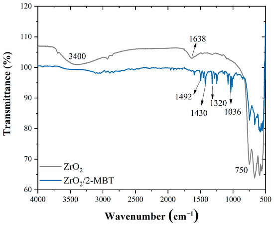 FTIR spectra of ZrO2 and ZrO2 loaded with 2-MBT.