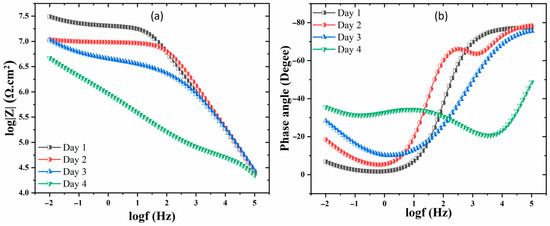 Electrochemical impedance spectroscopy (EIS) is the most important and valuable tool for the characterization of corrosion resistance properties of the coating systems [13]. A potentiostatic EIS test was carried out in 3.5 g per 100 mL NaCl solution for both reference and modified coatings. The EIS spectra obtained after the fitting were analyzed and depicted in Figure 5 and Figure 6 to obtain information on corrosion activity and corrosion protection performance of coatings. Bode plots for the reference coating (ZrO2) depicted in Figure 5a show the impedance value of above 10 M Ω⋅cm2 on the first day of immersion, which decreases even further by one order magnitude after 4 days of immersion due to water uptake and possible corrosion activity. The phase angle value for reference coatings dropped to −10 from −80 at the mid-frequency range. This makes the electrolyte (NaCl solution) easier to reach at active sites of the coating–steel interface, which leads to corrosion activity [14]. In contrast, modified coatings (ZrO2/2-MBT) show a higher impedance spectra value of 1 G Ω⋅cm2 at the low-frequency range in Figure 6a, which is due to the presence of ZrO2/2-MBT. The presence of anticorrosive pigment not only increases the impedance value but also the phase angle value remains close to −80 over a wide frequency range, as shown in Figure 6b. Moreover, the impedance spectra value for modified coatings increased above 100 G Ω⋅cm2 after 4 days of immersion due to the presence of corrosion inhibitor (2-MBT), which makes the coating more compact and reduces the active sites of corrosion [15]. This finding implies that the modified coating’s electrolyte uptake was delayed and that, in comparison to the reference coating, the coating barrier effect was significantly enhanced.