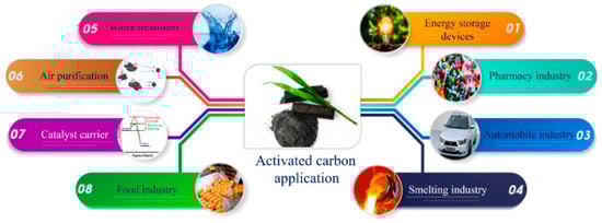 Over the past few decades, we have observed an increase in water and air pollution, caused by rapid industrialization, population growth, urbanization, and the reckless use of natural resources, among other factors []. The amount of waste and number of toxic gases released into the environment is increasing year after year due to the continuous development of industry and progress of civilization. On the other hand, the standards for permissible emissions of pollutants are constantly tightened []. The negative effects of fossil fuel use, rising pollution levels, climate change, and a growing global population have prompted the quest for more sustainable, efficient energy sources and energy storage technologies. Hydrogen has emerged as a prospective clean fuel alternative due to its clean-burning features and promise as a renewable energy source [,,]. However, effective hydrogen generation technologies, such as hydrogen evolution reactions (HER), continue to be challenging. To overcome this, researchers have investigated a variety of techniques to increase HER efficiency, including the use of activated carbon generated from fennel flower waste, which has shown promise as a sustainable and effective solution []. The invention is distinguished by its capacity to enhance the surface area of catalysts, resulting in better efficiency in separating hydrogen from oxygen in water and lowering hydrogen production costs. This technique not only helps to create clean energy technology, but it also gives a sustainable alternative for recycling agricultural waste, making it a potential initiative that combines environmental innovation with increased sustainable energy production.