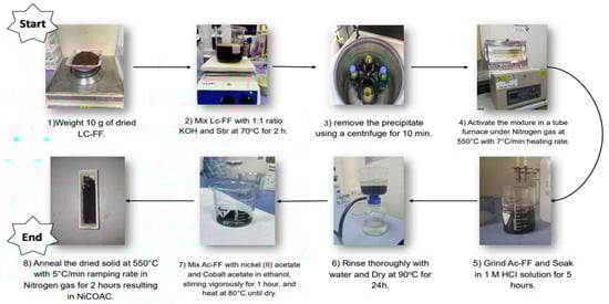Activation of LC-FF: LC-FF refers to fennel waste after crushing and burning. Impurities were removed from the LC-FF by first washing it with distilled water and then drying it at 70 °C for 8 h. Then, 10 g of dried LC-FF was added to 100 mL of deionized water. Then, 10 g of KOH was dissolved in 10 mL of deionized water, and then added to the LC-FF. The mixture was then agitated in an aqueous solution (H2O) of deionized water at 70 °C for 2 h, as shown in Figure 3. After 2 h, the mixture was left to cool, and then it was transferred to the centrifuge at 19 °C for 10 min at a rate of 4000 rpm to separate the liquid from the residue. The residue obtained was put into a crucible. The crucible was then transported to a tube furnace, as shown in Figure 3, linked to a nitrogen gas cylinder, allowing the heating process to take place in an inert atmosphere. The gadget was heated at a rate of 7 °C per minute to 450 °C for 2 h. Then, the crucible was removed, and the sample, now activated carbon, was collected. The sample was then crushed and put into 100 mL of 1 M hydrochloric acid (HCl) and left to settle for 5 h to remove potassium hydroxide (KOH), as shown in Figure 3. The precipitate was separated using vacuum filtering, as shown in Figure 3. After that, it was cleaned with water, filtered, and dried in a 90 °C oven for 24 h [].