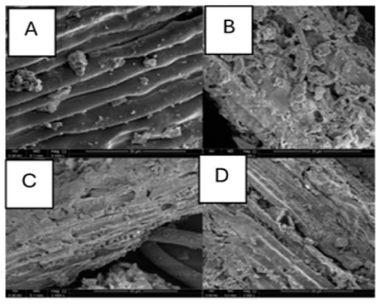 SEM images of the fennel waste sample before conversion to activated carbon show minimal porosity on the surface as shown in (A–D) indicating a dense.