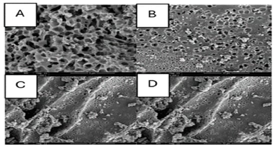 SEM images of the fennel waste sample after conversion to activated carbon, displaying a large amount of surface porosity, as shown in (A–D), indicating a highly porous and textured structure.