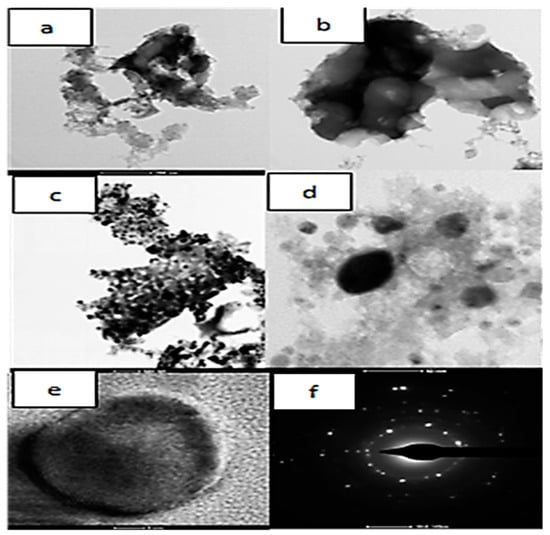The detailed examination using high-resolution transmission electron microscopy (TEM) offers valuable insights into the nanoscale structure of NiCo nanoparticles deposited on biochar. Figure 6a,b depict plain biochar without any metal deposits, representing the pure form of activated carbon. In contrast, Figure 6c,d show activated carbon with embedded NiCo nanoparticles. Figure 6e presents a high-resolution TEM image revealing the fine dispersion of NiCo nanoparticles attached to the biochar surface. These nanoparticles exhibit well-defined lattices and clear crystal fringes, indicating a highly crystalline nanostructure with primary particle sizes ranging from 2 to 5 nm. Furthermore, the selected area electron diffraction (SAED) pattern in Figure 6f displays distinct diffraction spots, confirming the single crystallinity of the nanoparticles. The indexing of the pattern identifies diffraction rings corresponding to the (111), (200), and (220) planes of face-centered cubic NiCo alloy nanocrystals. This thorough analysis confirms the successful impregnation of crystalline NiCo nanoparticles on the biochar, enabling the study of nanoparticle morphology, crystallinity, and phase—all crucial structural characteristics influencing catalyst performance.