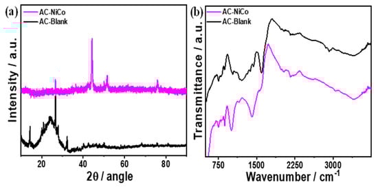 (a) XRD patterns and (b) FTIR spectra for activated carbon without (AC) and with nickel cobalt doping (AC-NiCo).