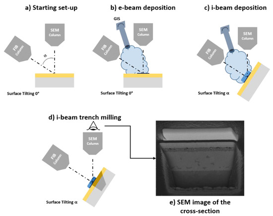Even if the cross-sectioning process can be performed only by using a FIB for a coarse determination of thick films, films down to 10 µm will require the use of a FIB/SEM equipped with a Gas Injection System (GIS). This because, in order to avoid FIB-induced surface degradation, a thin protective layer above the surface is needed. This can be achieved only by using a beam deposition process achievable with the presence of a GIS. In FIB/SEMs, the protective layer is produced by a two-step deposition process. First, a thin layer of metal is deposited on the surface using the electron beam (e-beam deposition). Then, a thicker metallic layer is deposited using the ionic beam (i-beam deposition). The e-beam deposition avoids surface degradation (and thus loss of thickness information on the topmost layer) due to direct impingement of the ionic beam on the surface [40]. The full workflow for the preparation of a cross-section using a FIB is visible in Figure 2.
