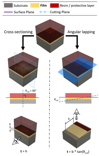 Angle lapping is a sample preparation method used to increase the resolution in thin-film thickness determination of the adopted microscopy characterization technique; it is based on a change in cutting geometry with respect to cross-sectioning (Section 2.1). During traditional preparation procedures, in order to unshed the stratigraphic information from the sample, the cutting plane is perpendicular to the surface (θcut = 90°) [41]. The uncovered section gives direct stratigraphic information on the displacement and thicknesses of the layers above the substrate. Instead, in angle lapping, the sectioning cut is performed at very low angles with respect to the sample surface (θcut < 10°). This produces a “magnification effect” on the newly created section surface, on which all the layers appear stretched (Figure 3). Knowing the cutting angle and a bit of trigonometry, it is consequently easy to derive the film thickness. The main advantage of this method is the magnification effect, which allows us to overcome the resolution limits of the microscopic technique adopted for the quantification, even for very thin films. As a prerequisite, a very flat film surface is mandatory for a precise determination of the thicknesses of the layers underneath; moreover, particular care must be put in the preparation of the surface after the cut. It is uncommon, especially for mechanically machined soft materials, to result in thin-film deformation on the cutting surface [42]. The origin of this sample preparation technique comes from the first metallographic studies, and it is still considered as a valuable method to overcome the resolution limits of the adopted microscopic characterization methods. Its adoption has shifted to FIB cross-sectioning or lamella preparation, enabling the fine characterization of ultrathin films. It can be used before both optical microscopy and SEM characterization.