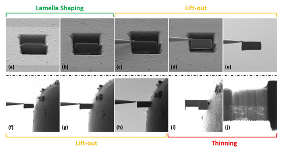SEM images of the main steps regarding TEM lamella preparation: (a) FIB digging; (b) border cut; (c) nanomanipulator welding; (d–f) lamella displacement; (g) support welding; (h) nanomanipulator detachment; (i) thinning; (j) lamella analysis with STEM.