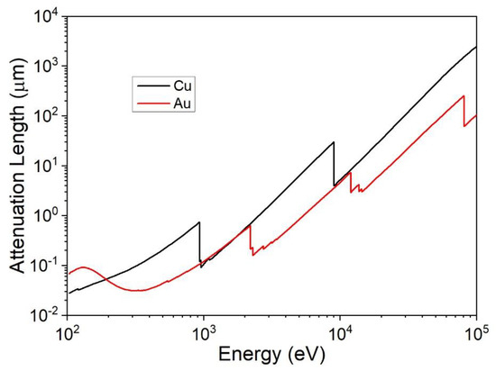 X-ray attenuation length as a function of the energy of the photons for copper and gold.
