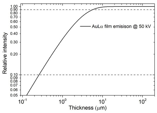 XRF is the most common instrument used by industries for film thickness investigation since it is fast, non-destructive, and relatively simple to use, making it perfect for the quality control of the products [75,76], and for this reason there are present also standard procedures to perform the measurement like ISO 3497 [77] and ASTM B568 [78]. Commercial instruments can measure easily the thicknesses of almost every material (with some restriction for lighter elements), whether conductive or not, in the range of 10 nm to 100 µm [79,80]; nevertheless, depending on the materials under investigation and the instrumental settings, the limits of measurement could be extended from less than 1 nm [81] to a few centimetres [82]. The lateral resolution of XRF is very low, and spot size commonly ranges from 0.1 to 15 mm. The relative intensity (normalized respect to the bulk element) emitted from a film follows an exponential trend [18], but could be approximated to a second-order curve for small films far from the saturation thickness [7]. The emission of a gold film on Cu substrate, as a function of the thickness, is reported in Figure 9 using a log-log scale. In this case, the range of thicknesses between the relative intensities of 0.9 (semi-infinite thickness [83]) and 0.1 (infinitely small) of gold is between 0.2 µm and 50 µm.
