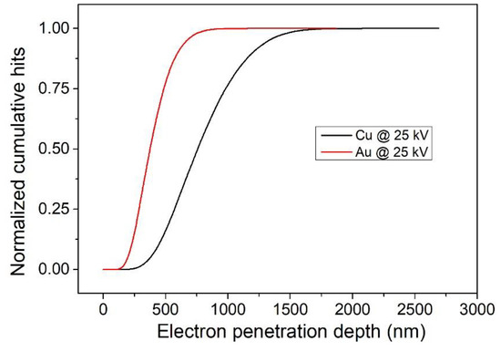 The penetration depth of electrons with an energy of 25 keV in copper and gold.