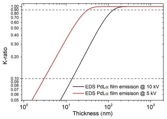 In 2016, Sokolov [124] measured the thickness of Silicon dioxide and silicon nitride thin films using EDS, varying the penetration depth of the analysis, changing the acceleration voltage of the beam, and correlating the thickness of the film with the signal of the substrate elements to the collected noise. Stanford [173] in 2020 measured the oxide layer formation on Pu from 35 nm to 400 nm using measured standards to build the k-ratio calibration curves of oxygen through FIM-SEM analysis. Previously, Bastin made a massive study collecting the K-ratios of Al [174] and Pd [175] of films from 10 to 320 nm in thickness at various beam energies between 3 kV and 30 kV on many substrates between Be and Bi.