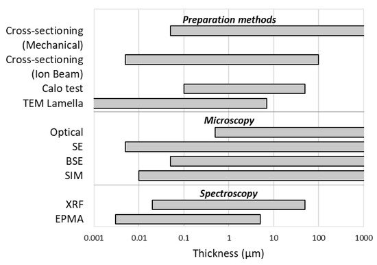 Talking about the measurable ranges of thickness, microscopic techniques tend to have only a lower limit, dictated by the aberrations that the beam undergoes under certain dimensions, while it is possible to lower the magnifications until observing shapes above the millimeter level. Spectroscopic techniques instead suffer from the attenuation of the signal inside the sample and, therefore, cannot measure coatings beyond a certain size which appear as infinitely thick. Furthermore, for those analysis techniques that require sample preparation, the range that can be analyzed is the intersection of the ranges of the individual techniques.