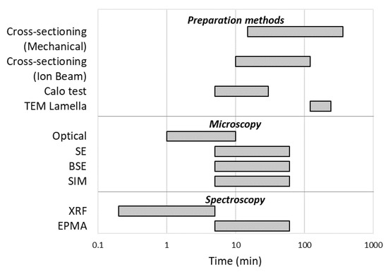 Considering now the preparation and measurement time, it is highly dependent on the presence of automated systems and on the experience and manual skills of the operator, as well as on the degree of accuracy required for the result. In general, the XRF, in addition to being extremely versatile, is the fastest technique, not even requiring sample preparation. On the other hand, microscopic techniques coupled to cross-sectioning are extremely widespread as they allow us to obtain a result in which the thickness is directly visible. Furthermore, cross-sectioning, although time-consuming, is a procedure that is generally automated.