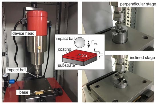 The surface responses of various materials can be investigated at various repetitive loads and impact times using impact test devices, as presented in the literature [,,]. Using an electro-dynamic impact tester, impact times less than 1 ms can be realized []. Furthermore, via a piezoelectric one, impact times longer than 1 ms can be adjusted []. Figure 1 illustrates the impact tester and the related fixtures for conducting perpendicular and inclined impact tests. This device was manufactured by the company Impact-BZ (London, UK) [] in conjunction with the Laboratory for Machine Tools and Manufacturing Engineering of the Aristotle University of Thessaloniki. A ceramic ball of 5 mm diameter repetitively penetrated into the specimen under an adjustable maximum load. With the aid of a proportional, integral and differential (PID) controller, the output voltage of a variable transformer, through a direct current (DC) motor, was adjusted to attain constant impact force peaks throughout the entire test duration. Moreover, measurements of current, forces, temperatures and further process parameters were conducted and monitored. Employing this impact tester, various coatings’ properties at ambient or elevated temperatures can be characterized, and related material data, defined. In the next sections, relevant application examples will be presented as well as finite element method (FEM)-supported procedures for evaluating the results and determining data such as the fatigue endurance stress and coating adhesion of PVD as well as those of diamond coatings.