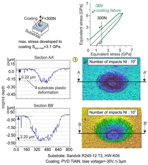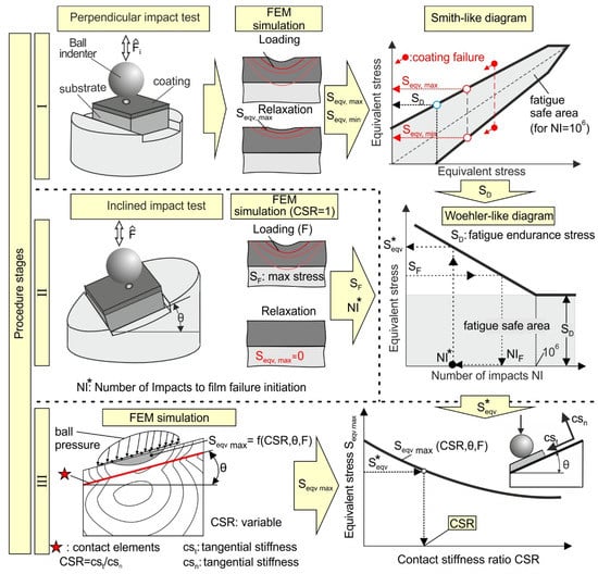 During the impact test, a ball indenter periodically penetrated the coating under a desired maximum load. Depending on the impact load and on the number of impacts, a coating failure could occur. The perpendicular impact tests were aimed at detecting the maximum impact force Fmax (fatigue threshold force) that the coating could withstand without failure. With the aid of a FEM simulation of the impact test, the maximum equivalent stress developed in the coating at the fatigue threshold force Fmax during its loading and the remaining one due to the substrate plastic deformation was calculated. Based on these data, the Smith-like diagram illustrated in Figure 2 was established []. Via this diagram, the coating fatigue endurance stress SD for repetitive loads from zero up to a certain maximum value was determined. Considering SD, the Woehler-like diagram demonstrated in the middle of Figure 2 was created. The data employed for establishing the aforementioned graphs did not depend on the coating adhesion, since the film was only vertically loaded during the perpendicular impact test.