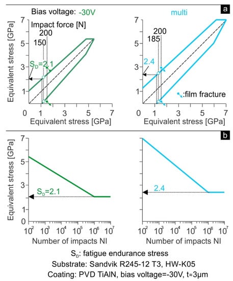 Using the FEM-supported simulation of the impact test mentioned in Figure 2 [], the maximum equivalent stress during the impact test loading and relaxation at the force of 200 N and at the fatigue threshold loads of the PVD TiALN coatings deposited at various bias voltages were calculated. Based on these data, as schematically depicted in Figure 2, the Smith-like diagrams demonstrated in Figure 4a were established for the investigated coatings. Employing the latter graphs, the coating’s fatigue endurance stresses SD for repetitive loading from zero to a maximum value were defined. Considering these stresses, the Woehler-like diagrams of the investigated coatings shown in Figure 4b were established. These results show that the bias voltage augmentation increased the coating’s fatigue endurance stresses.