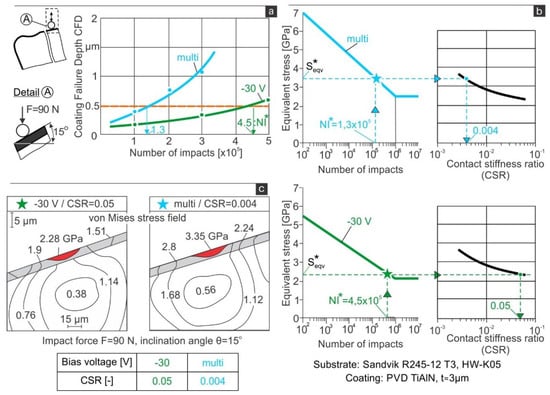 (a) Coating failure depth versus the number of impacts during the inclined impact tests on the investigated PVD films. (b) Determination of the contact stiffness ratios (CSR), quantifying the adhesion of the tested coatings. (c) FEM-calculated equivalent stress distributions during the inclined impact test on the coatings prepared at −30 V and multi-bias voltage possessing different adhesion strengths.