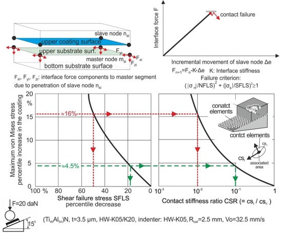Based on a method described in [], the film adhesion can be quantified according to the critical shear failure stress (SFLS). To predict the SFLS in the coating–substrate region, a 3D-FEA model that dynamically simulates the inclined impact test was developed. The occurring SFLS at the coating–substrate interface affects the stresses resulting in the film during the operation of a coated component. In this way, they may lead to potential film material overloading and its cohesive failure. In the right part of Figure 6, the effect of the shear failure stress percentile decrease on the film overloading during the inclined impact test is shown. Moreover, the maximum stress percentile increase at a lower CSR is estimated considering the ideal adhesion (CSR = 1) as a reference. Thus, the maximum stress percentile increase at various CSRs can be related to certain SFLS percentile decreases (see Figure 6). For example, when the CSR amounts to about 0.1 or 0.01, the SFLS percentile decrease amounts to 18 or 50%, respectively, and a maximum film stress percentile increase of 4.5 and 16% develops in the corresponding cases.