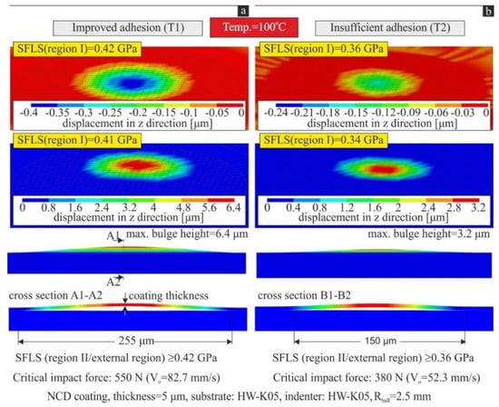 By using the previously described FEM model [,], the critical SFLS values for preventing the fatigue damage of the NCD coating–substrate interface after 106 impacts at various temperatures were estimated for different adhesion qualities. Figure 7a,b show characteristic calculated imprints at various SFLS values, after the ball indenter removal at a test temperature of 100 °C. There was a remaining displacement of ca. 0.4 μm in the improved NCD film adhesion case, at an SFLS equal to 0.42 GPa, after the ball removal due to substrate plastic deformation (see Figure 7a). A slight decrease in SFLS from 0.42 to 0.41 GPa in Region I resulted in coating detachment and bulge formation. Thus, an SFLS of 0.42 GPa was associated with the maximum operational stress permitted at the NCD coating–substrate interface for preventing the coating detachment initiation at a temperature of 100 °C. Related FEM calculations were carried out in the insufficient NCD film adhesion case at the same temperature of 100 °C. The percentile decrease in the SFLS in the insufficient adhesion case compared to that of the improved one amounted to approximately 17%.
