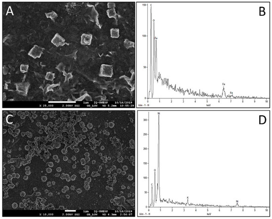 The successful electrosynthesis of nickel-iron oxyhydroxide microparticles on RGO was confirmed by SEM and EDX. Figure 1A shows the electrode surface only with RGO/FeOOH; the microscopy showed a distribution of cuboids over the electrode surface. Figure 1C shows the electrode surface only with RGO/NiOOH; the microscopy showed an excellent homogeneous distribution of microspheres. The EDX spectroscopies confirmed the presence of Ni and Fe on the surfaces; the spectra also showed the presence of C, O and K.