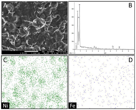 The Figure 2A shows the surface of the EGP/RGO/NiOOH-FeOOH electrode; the surface had different characteristics than expected, as iron had formed cuboids and nickel had formed spheres. It was expected microparticles with shapes similar to those previously formed; however, microscopies showed several elevations with connected “wires”. In Figure 2B, it can be observed that, in the EDX spectrum of the EGP/RGO/NiOOH-FeOOH electrode, the surface is composed of Ni, Fe, O, C and K; analysis showed a high amount of nickel and reasonable amounts of iron on the electrode surface, showing that the electrodeposition of the bimetallic microparticles was successful. Figure 2C,D shows the mapping of the microparticles on the electrode surface. Here, it can be observed that the nickel had a good distribution on the electrode surface and formed particle clusters; however, the iron presented smaller amounts of particles.