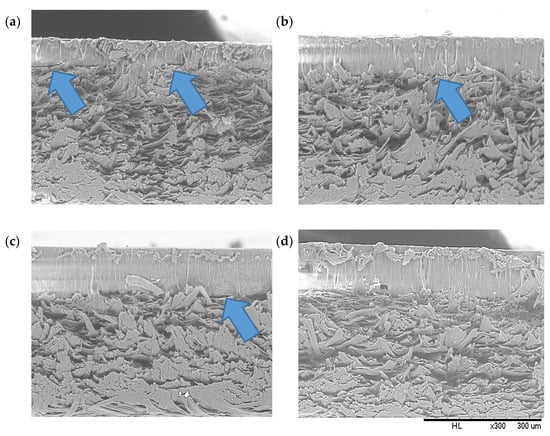 SEM evaluation of PHB/fibrillated cellulose paper coatings in cross-sectional view at comparable magnification 5000×, including (a) pure PHB, (b) MFC-5 coating, (c) NFC-5 coating, and (d) mMFC-5 coating (same scale-bar applies to all figures). Blue arrows point to interface defects between coating and paper substrate.